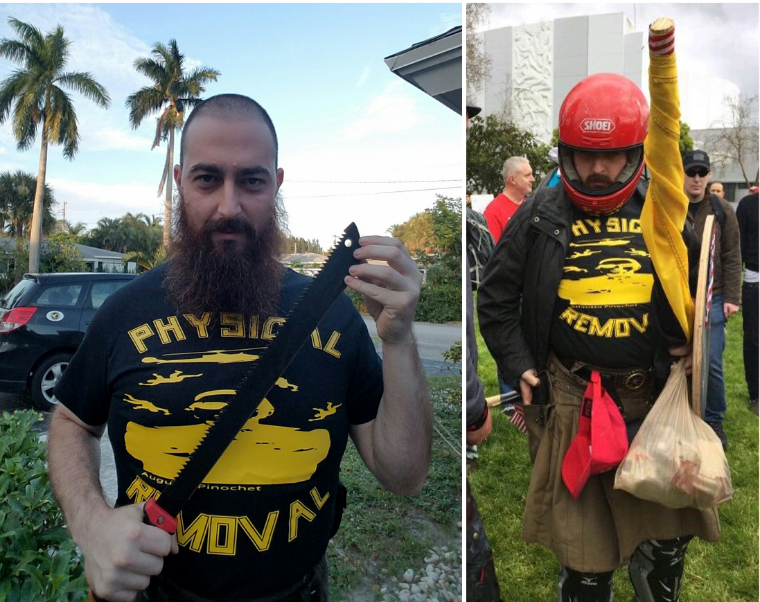 Violent fascist Daniel Quillinan, pictured on Nov. 2016 (left) and at the “March 4 Trump” in Berkeley, CA on Mar. 4, 2017 (right). Quillinan’s role in organizing fascist violence in the Bay Area has been well-document by anti-racist activists. He is the plaintiff and main witness in the trial against the 5 protesters. See https://nocara.blackblogs.org/2017/03/16/piss-kilts-and-sticks-how-violent-trump-supporters-are-merging-with-the-alt-right/