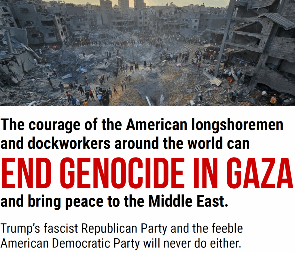 - American Longshoremen: Join the Movement of Striking Dockworkers in Europe and North Africa to Immediately Crush the Trump/Netanyahu Policies of Genocide, Ethnic-Cleansing, and the Occupation of Gaza, and End the Constant Threat of Nuclear War and World War III