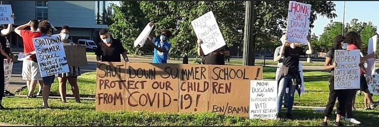 BAMN is proud to have been fighting for mandatory Covid-19 testing, mandatory vaccinations, and most importantly, for quality, safe, remote learning since the beginning of the pandemic. We have taken the Detroit school district to court to demand mandatory PCR testing, we led pickets to block school buses to force the district to stop endangering students’ lives and provide remote learning. As we started the 2022 year, Detroit was one of the few urban districts in the nation to start the year with remote learning. In other cities like Los Angeles, Flint, Oakland, San Francisco, Berkeley, we’ve held car caravans and held Zoom press conferences, fighting for all these demands. All along, we have understood that the same militancy and determination of the George Floyd Movement at a national level, independent from politicians, and prioritizing lives over corporate profits is the only way to defeat this pandemic. And we are re-energized by the recent student and teacher led actions, and excited to build our movement by any means necessary.