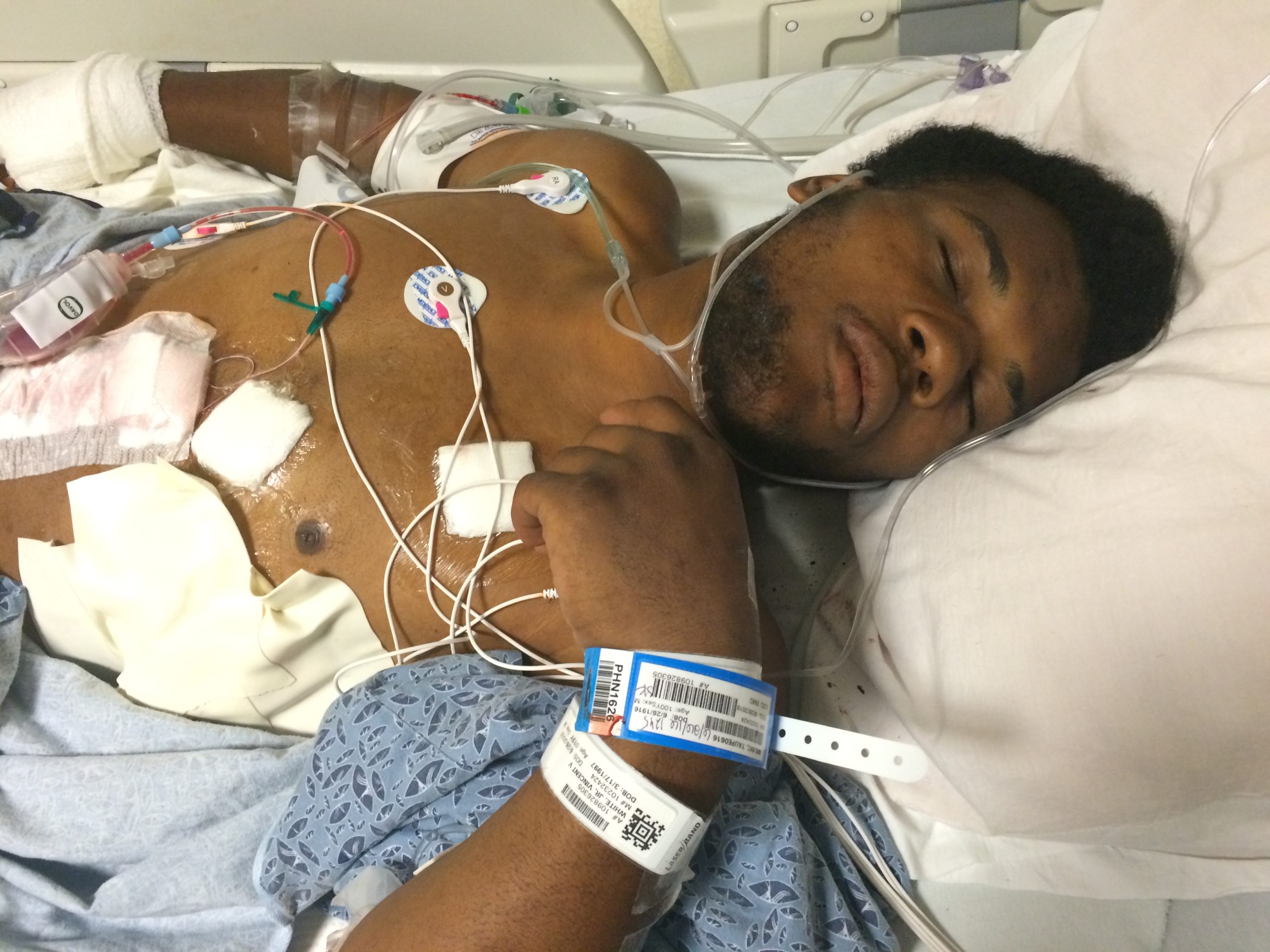 Anti-Fascist Protester Vincent White in hospital after suffering multiple stab wounds. Police interviewed him in the hospital right after undergoing surgery.